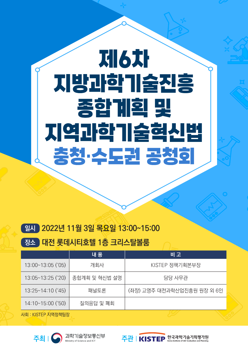 - [일반공지] [한국과학기술기획평가원] 제6차 지방과학기술진흥종합계획(안) 및 지역과학기술혁신법(안) 충청·수도권 공청회 개최 및 참석 안내