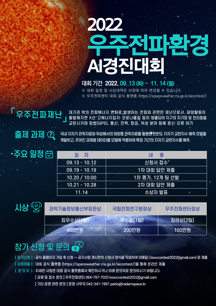 - [우주전파센터] 「2022년 우주전파재난 예측 인공지능(AI) 경진대회」개최 알림 안내
