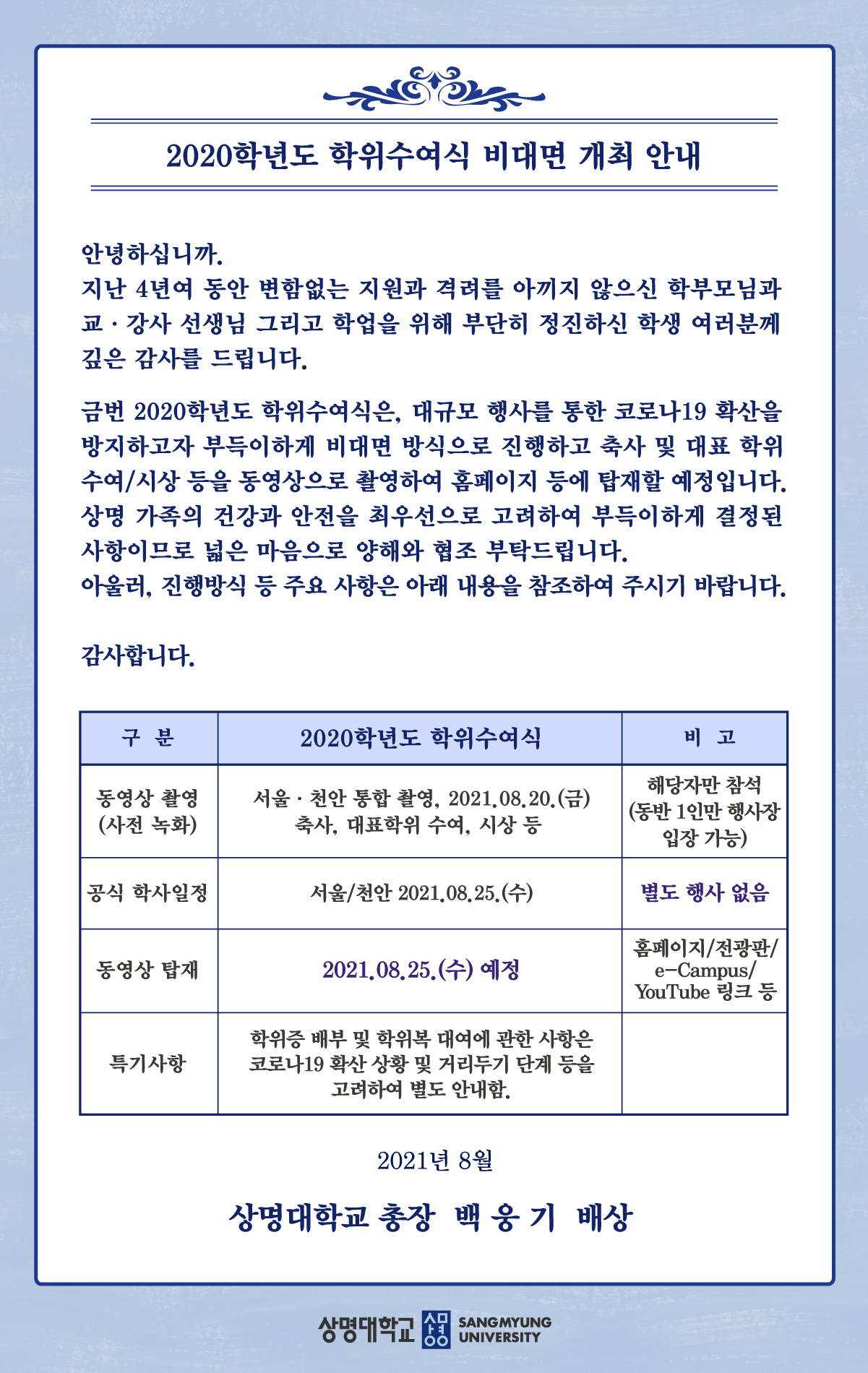 - [학사] 2020학년도 학위수여식 비대면 개최 안내
