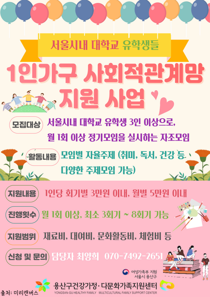 - [생활] 용산구 건강가정 다문화가족지원센터 1인가구지원사업 '사회적 관계망 지원' 참가자 모집 안내