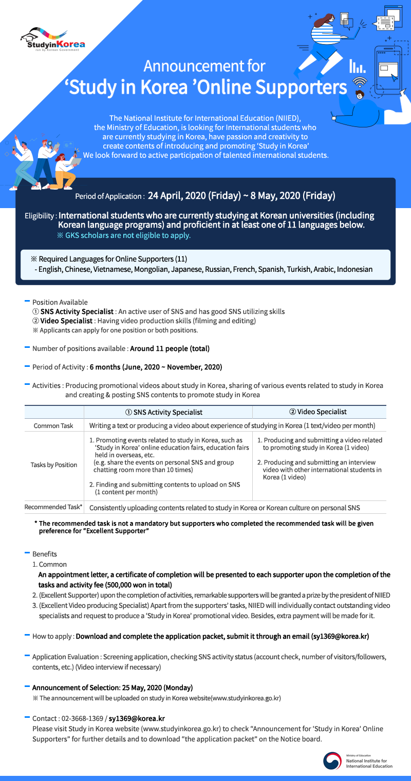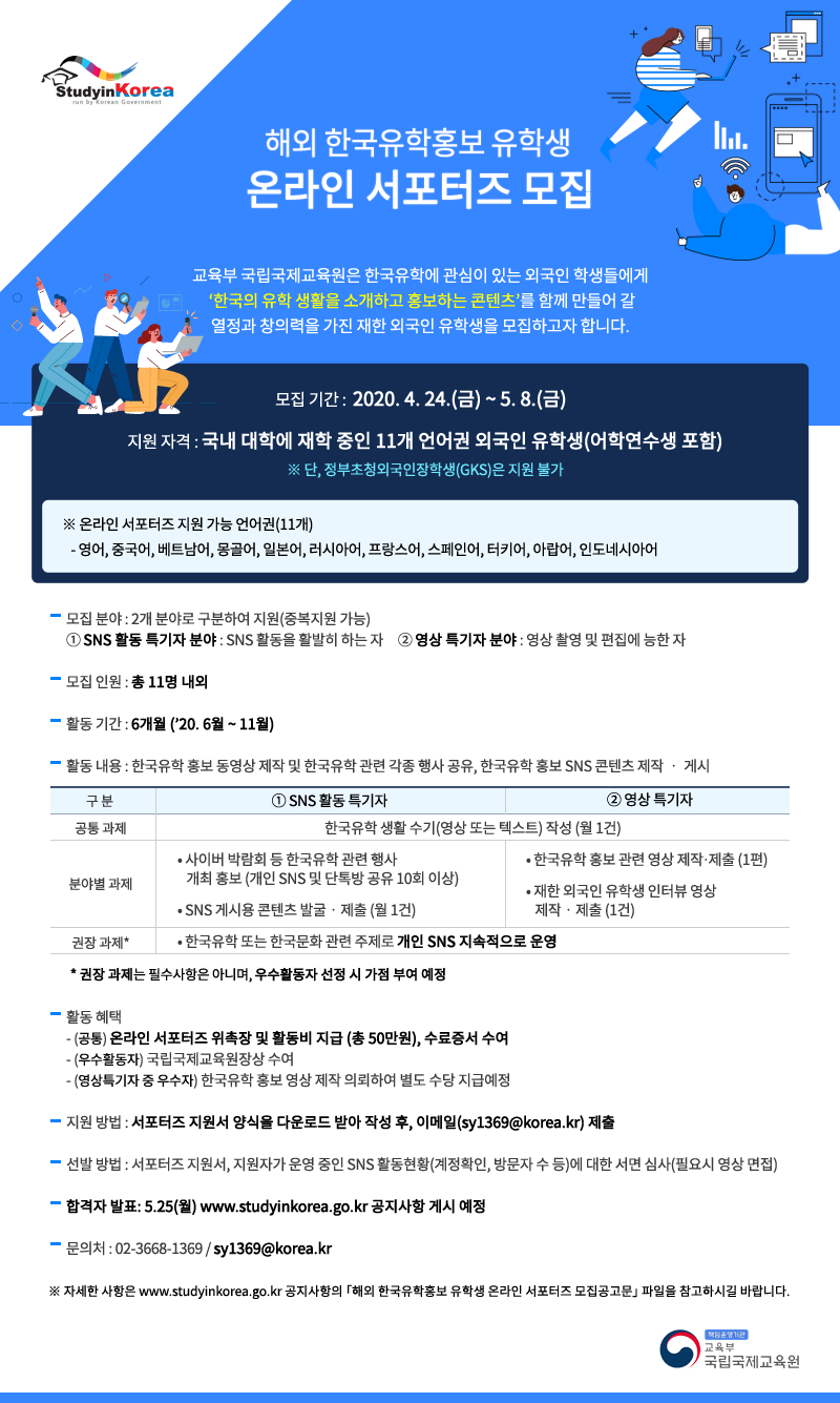 - 2020년 해외 한국유학홍보 유학생 온라인 서포터즈 모집 안내