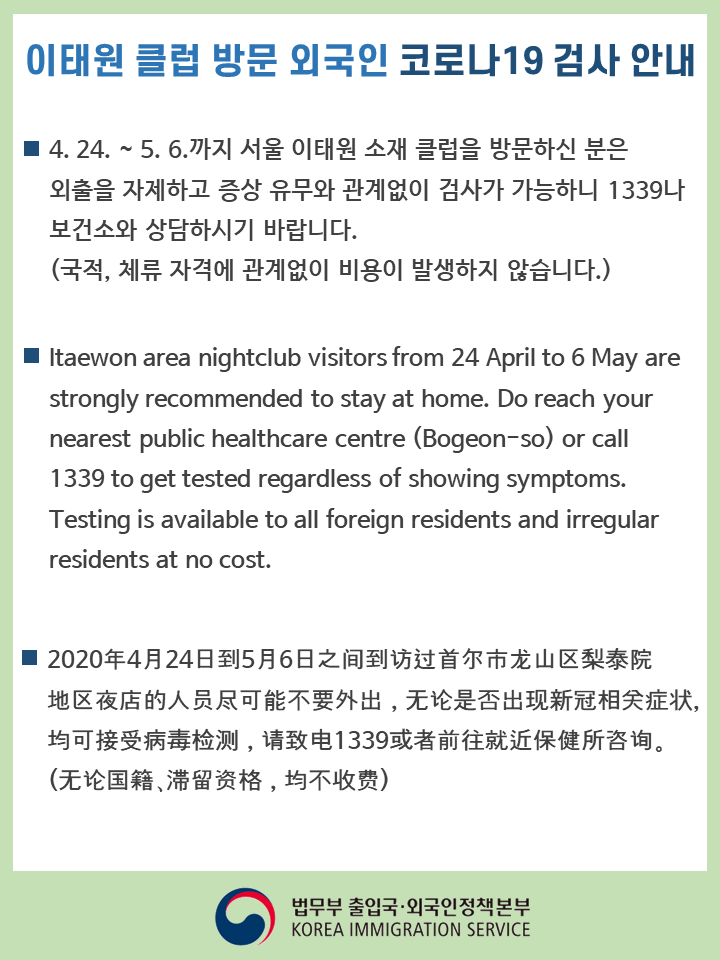 - [코로나19] 이태원 클럽 방문 외국인 코로나19 검사 안내